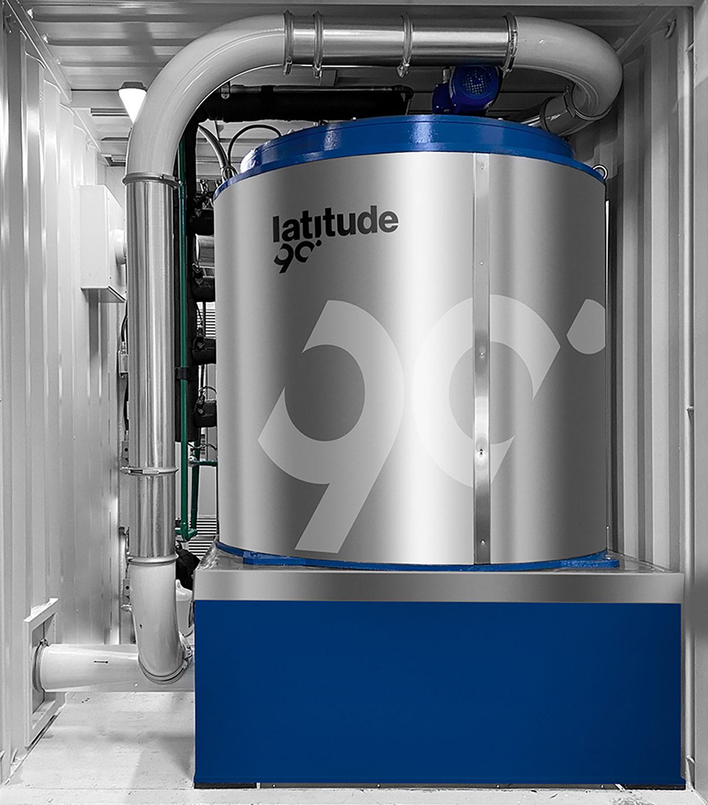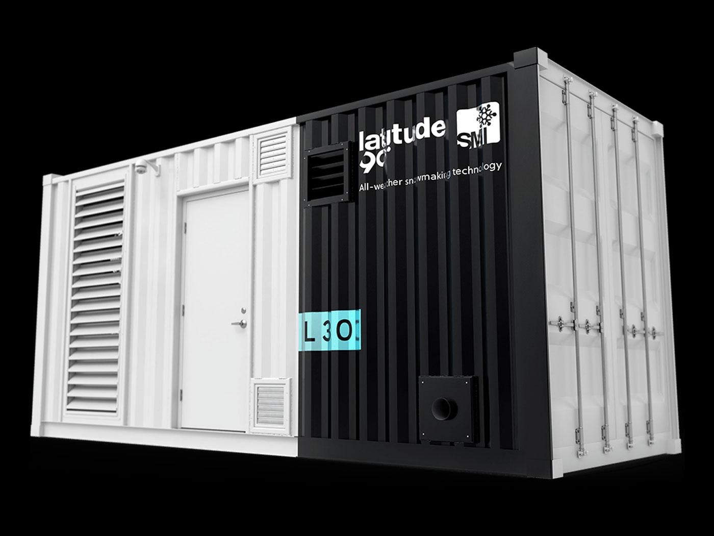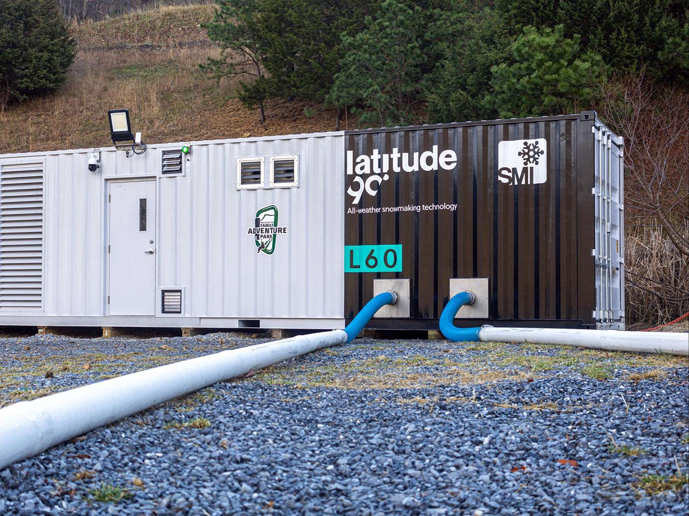 By contrast, the Latitude 90 systems are an enclosed, containerized unit that produces snow inside a controlled environment, then pushes that snow out onto the slope. Because the snow is created within a refrigerated chamber, it’s marketed as being less dependent on outside temperature and humidity than conventional snowmaking.